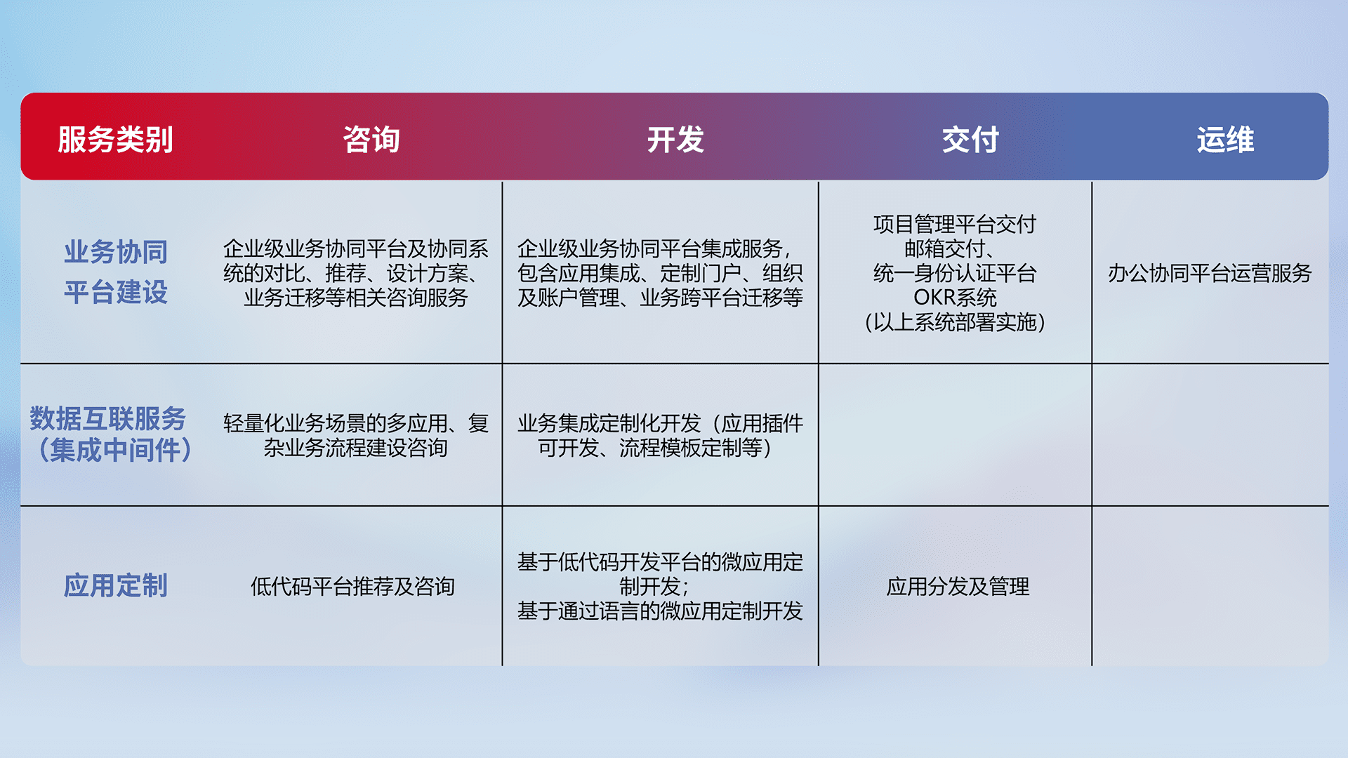 针对钉钉、、、企微、、、、IDaas等平台级产品提供产品的规划、、、、方案、、、交付、、、定制化开发等服务,,,,实现如统一协同办公、、、智能客户服务、、、、混合会议管理、、智能数据查询、、等业务场景,,,实现数字化转型。。。